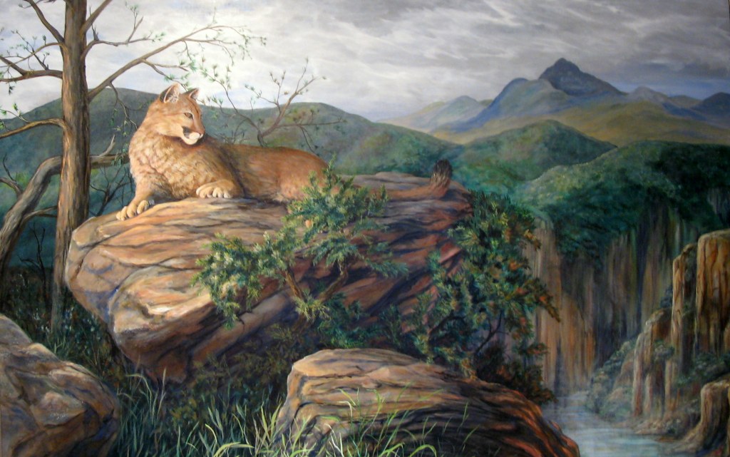“Unlikely Encounter” – Jaguar and Leopard – scratchboard and acrylic – 19″x36″ – In the wild these two would never meet. Jaguars live in the jungles of Central America, and leopards live in the savannahs of Africa. But people get them confused when they see pictures of them. The most noticeable differences are that jaguars are large and stocky and their spots have inner spots, while leopards are smaller and their spots are empty. I’ve chosen to depict a male jaguar and a female leopard to accentuate their differences.