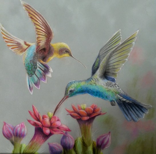 Catching the Light – Broad-Tailed Hummingbird – 9×9.5″ – color pencil – $1200 framed – inspired by a photo by Laura Silverstein, with permission