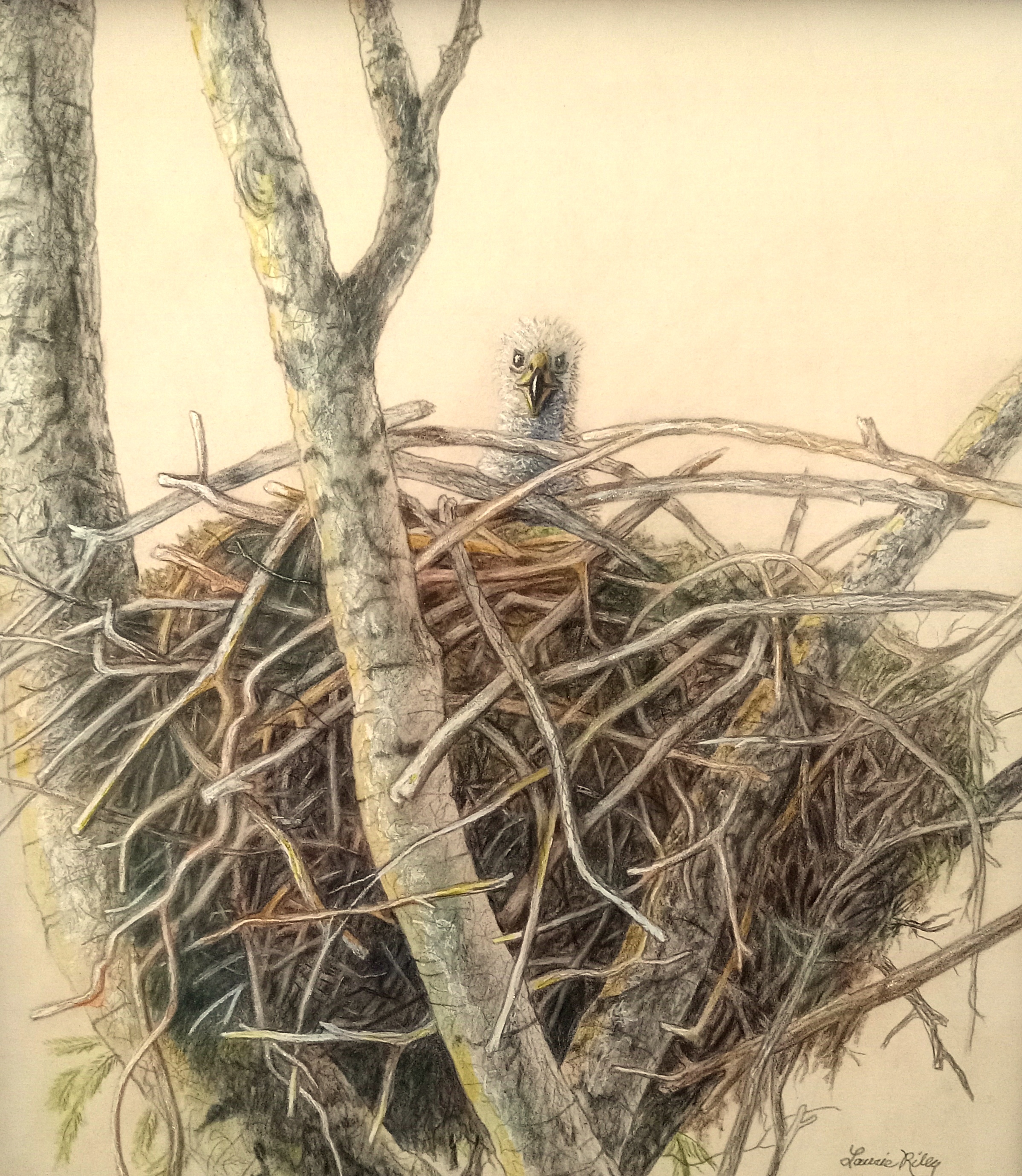 “where’s Mom?” – Eagle chick – color pencil on suede board -10.5×12″ – $2200 framed. Inspired by a photo by Ty Kent, with permission.