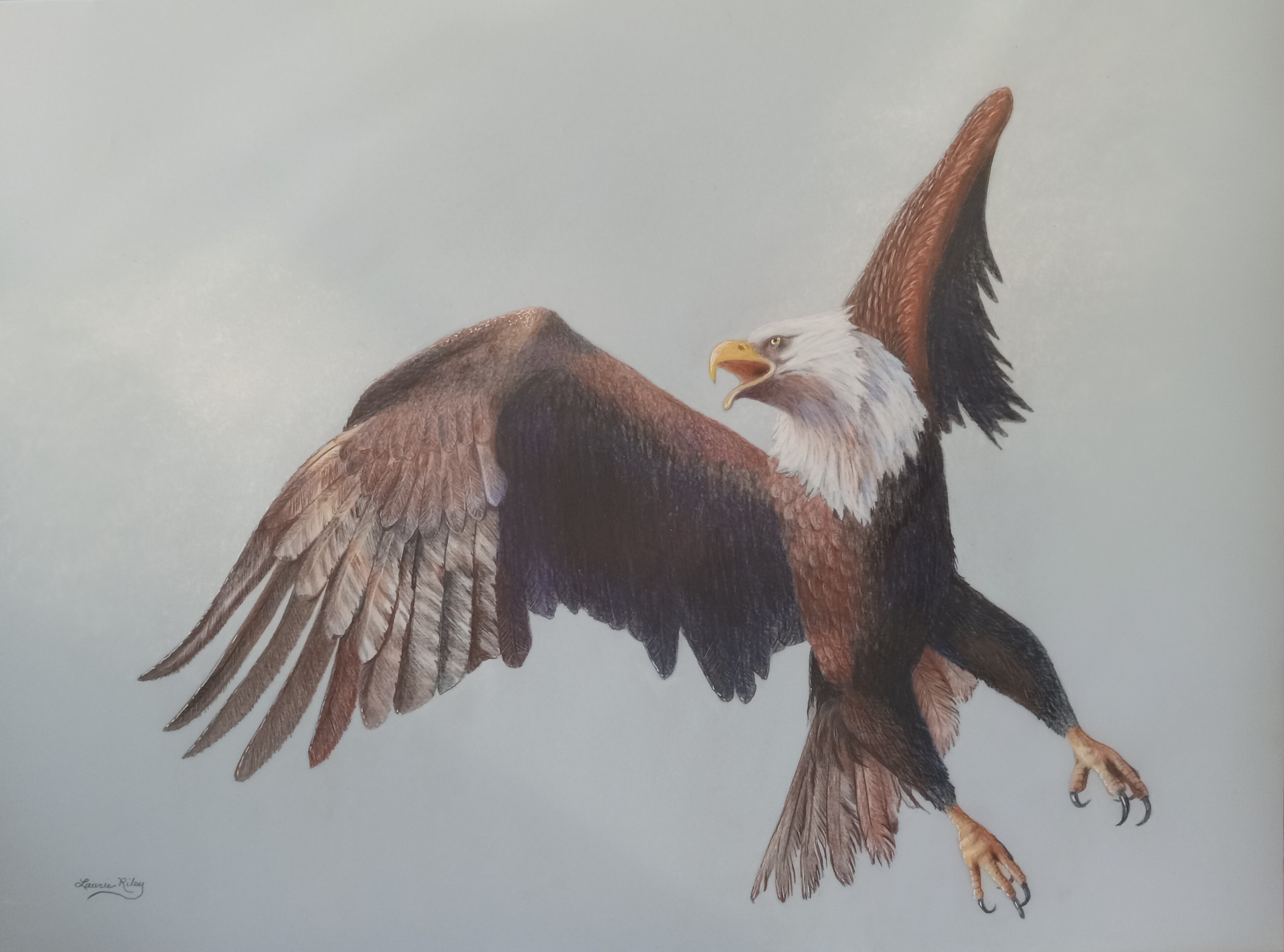 Calling to the Sky – Bald Eagle – Color Pencil – 20″x15″ – $3200 – inspired by the photography of Hawk Henries, by permission