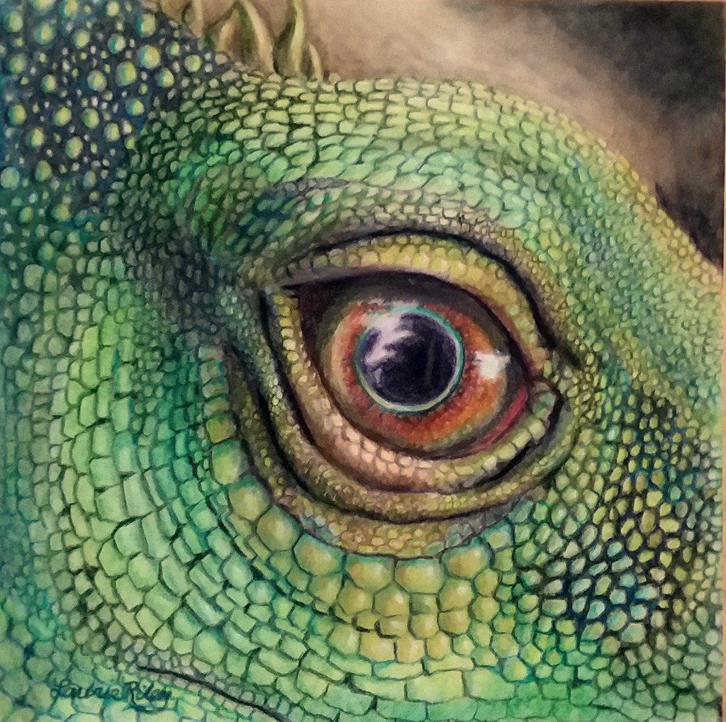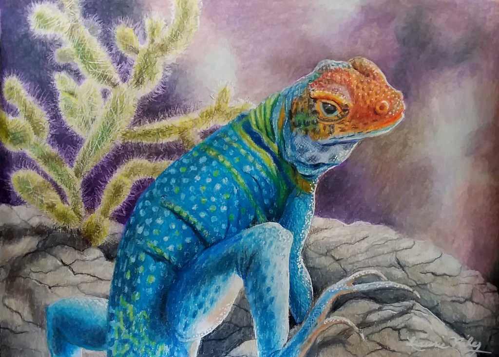 Dressed for Success – Orange Iguana – during mating season, some male iguanas take on a bright orange color for attention. This color pencil piece measures 9×12″. Price $3200 framed.