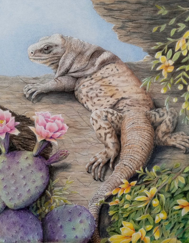 San Esteban Chuckwalla with prickly pear and creosote blossoms – 9×12″ – $2400 framed